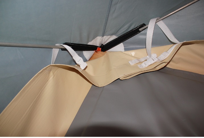 Уникальная система крепления, разработанная компанией, позволяет надежно зафиксировать пол к каркасу палатки при помощи стропы с фастексом. Имеет дополнительные 4 оттяжки для крепления на льду.