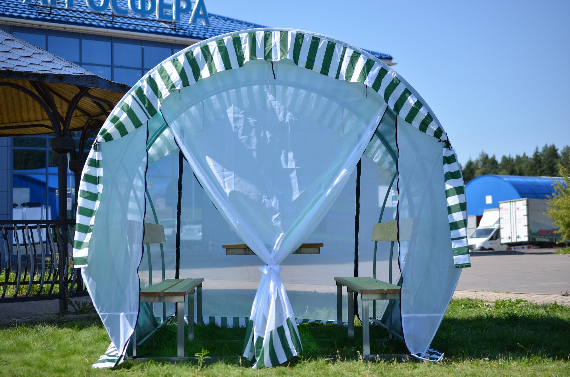 Устройство входных зон обеспечивает доступ с обоих торцов беседки и позволяет проветривать зону отдыха в жаркий день, в тоже время придавая ей легкое рассеянное затенение.