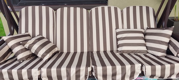 Вы можете приобрести комплект чехлов-сидений, предназначенных для четырёхместных качелей. Изготовлен данный чехол-сидение из ткани с водоотталкивающей пропиткой, наполнен данный чехол поролоном 10 см. Для изготовления данного чехла использовалась смесовая ткань рогожка с мягким подголовником, изготовленным из микровелюра. Рогожка является очень прочной и износоустойчивой тканью.